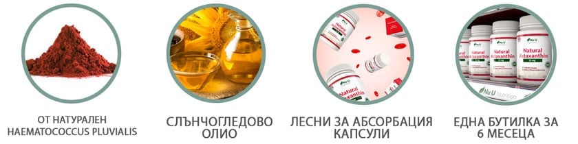 Други съставки: Слънчогледово масло, капсула (желатин, глицерин), астаксантиново масло 12 мг, от което 5% астаксантин (0,6 мг).